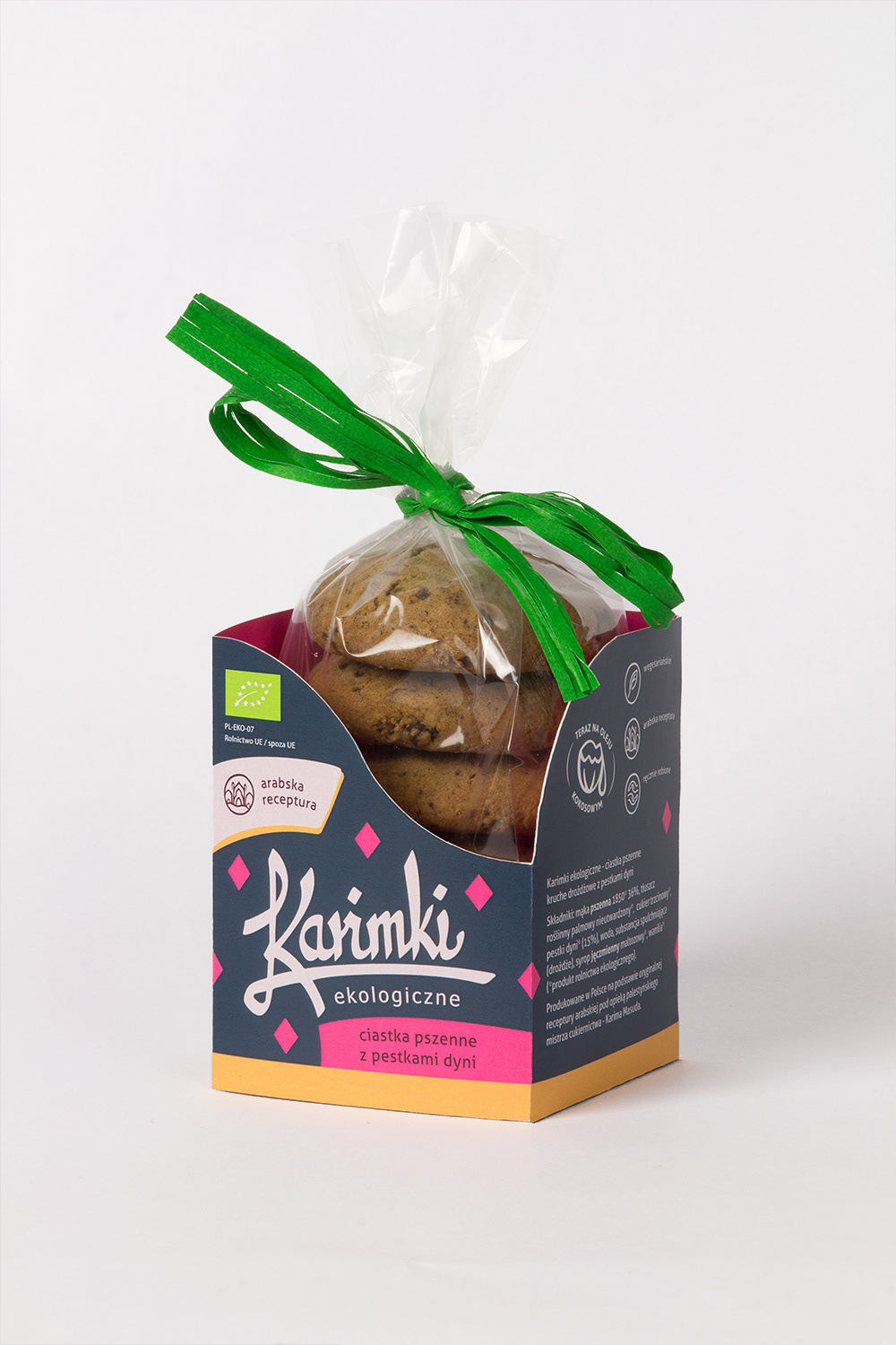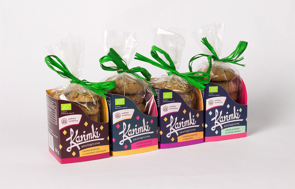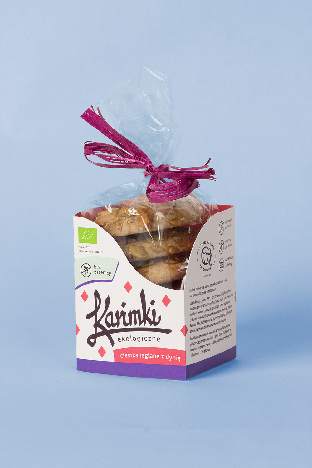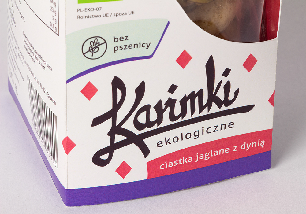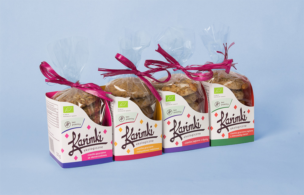 Projekt opakowań na ciastka dla polskiego producenta. Zestaw zawiera dwa warianty ciastek - bez pszenicy oraz pszenne. Warianty te zostały zróżnicowane kolorystycznie.